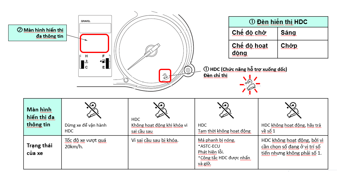 Khi bất kì điều kiện nào như trên được thỏa mãn, HDC sẽ được tắt và màn hình hiển thị đa thông tin sẽ báo.