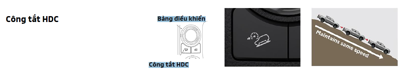Khi người lái nhấn công tắt này, chức năng HDC có thể được bật/tắt. Khi HDC được bật, đèn chỉ thị HDC trên bảng đồng hồ táp lô sẽ sáng.