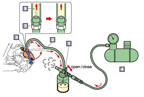(5) Xiết chặt nút xả khí sau khi không còn bọt khí trong dầu phanh chảy ra.