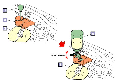 (3) Lắp bộ thay dầu phanh vào bình chứa xylanh phanh chính.