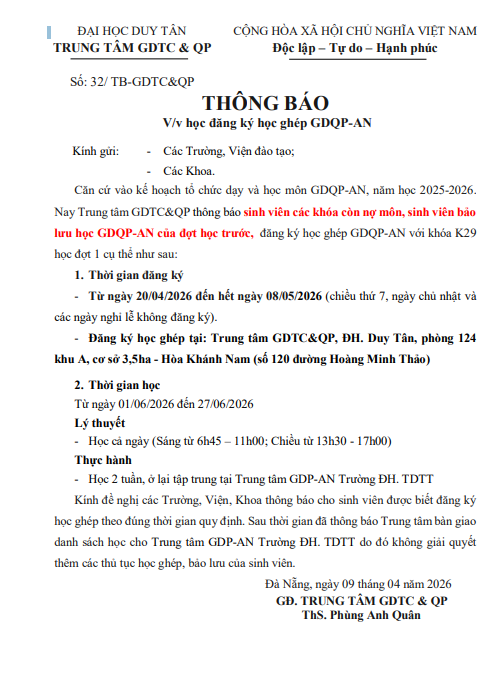 Thông báo về việc đăng ký học ghép giáo dục quốc phòng - an ninh