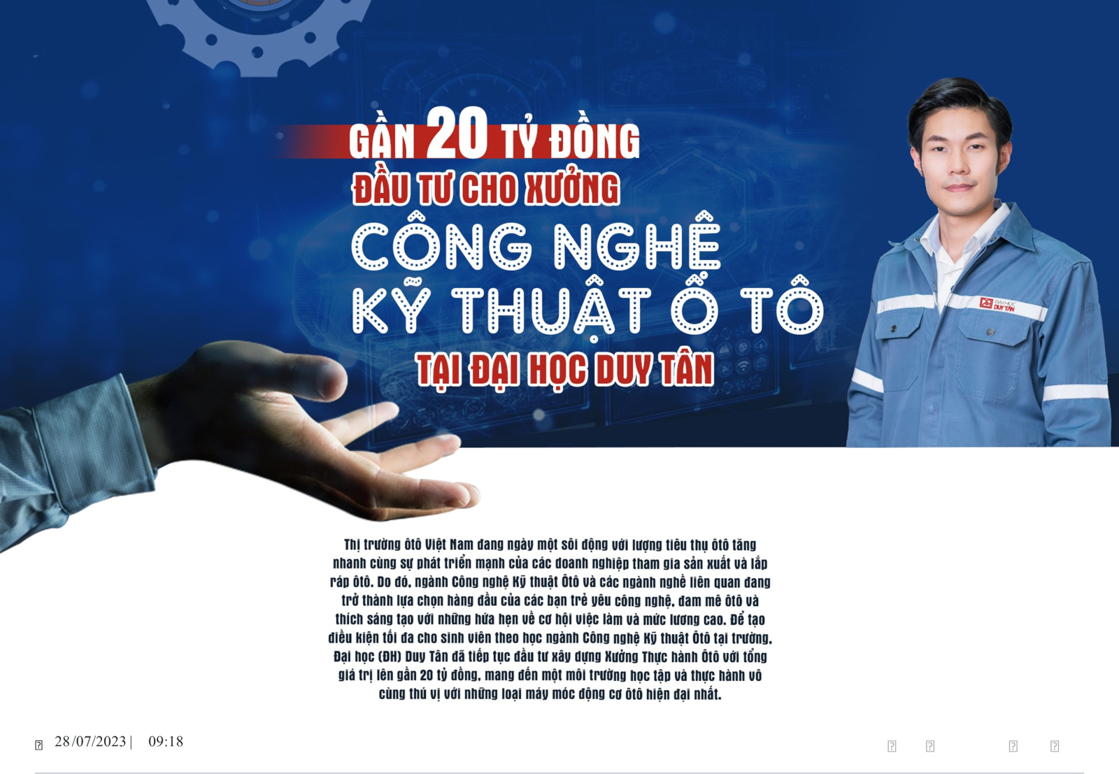 Nhận định về tầm quan trọng cũng như lợi ích của việc xây dựng hệ thống phòng thực hành để đào tạo các ngành về Công nghệ Kỹ thuật Ôtô tại trường, PGS.TS. Hà Đắc Bình - Hiệu trưởng Trường Công nghệ (SET), ĐH Duy Tân cho biết: “Chương trình đào tạo ngành Công nghệ Kỹ thuật Ôtô ở ĐH Duy Tân có sự gắn kết sâu rộng giữa kiến thức lý thuyết với thực hành dựa trên những yêu cầu thực tiễn của doanh nghiệp. Từ việc được thực tập ở trong hệ thống các phòng thực hành với nhiều trang thiết bị hiện đại trong trường mà sinh viên ngay khi tốt nghiệp có thể hòa nhập ngay vào môi trường làm việc của các doanh nghiệp, tiết kiệm cho doanh nghiệp nhiều thời gian và kinh phí huấn luyện tay nghề cho nhân viên mới. Hiện nay, cơ hội việc làm của ngành này là rất lớn, cụ thể trong nước có các nhà máy Thaco, Vinfast, Hyundai, Toyota, Honda, Mitsubishi,... đồng thời ở nước ngoài có rất nhiều cơ hội du học, thực tập hay đi lao động tại Nhật Bản, Hàn Quốc,… Ngoài ra, sinh viên ra trường còn có thể tự khởi nghiệp trong lĩnh vực bảo hành, sửa chữa, chăm sóc kỹ thuật cho các phương tiện xe cộ.”