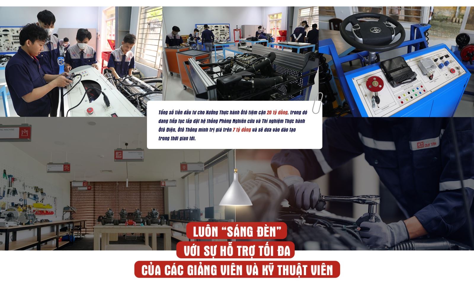 Giúp sinh viên dễ dàng tiếp thu kiến thức lý thuyết cũng như thành thạo các kỹ năng thực hành đáp ứng được những yêu cầu thực tế của công việc sau khi sinh viên tốt nghiệp ra trường, Xưởng Thực hành Ôtô DTU luôn “sáng đèn” với sự hỗ trợ tối đa của các giảng viên và kỹ thuật viên. Mỗi phòng Lab luôn có các thầy cô từ các hãng Mitsubishi Đà Nẵng, ThaCo Trường Hải, Toyota, Ôtô Tiến Thu,… thường xuyên được mời đến Xưởng Thực hành Ôtô DTU để giảng dạy, nâng cao năng lực thực hành, giúp mỗi sinh viên theo học ngành Công nghệ Kỹ thuật Ôtô luôn vững tin sẽ trở thành một kỹ sư giỏi để phát triển sự nghiệp ở tương lai.