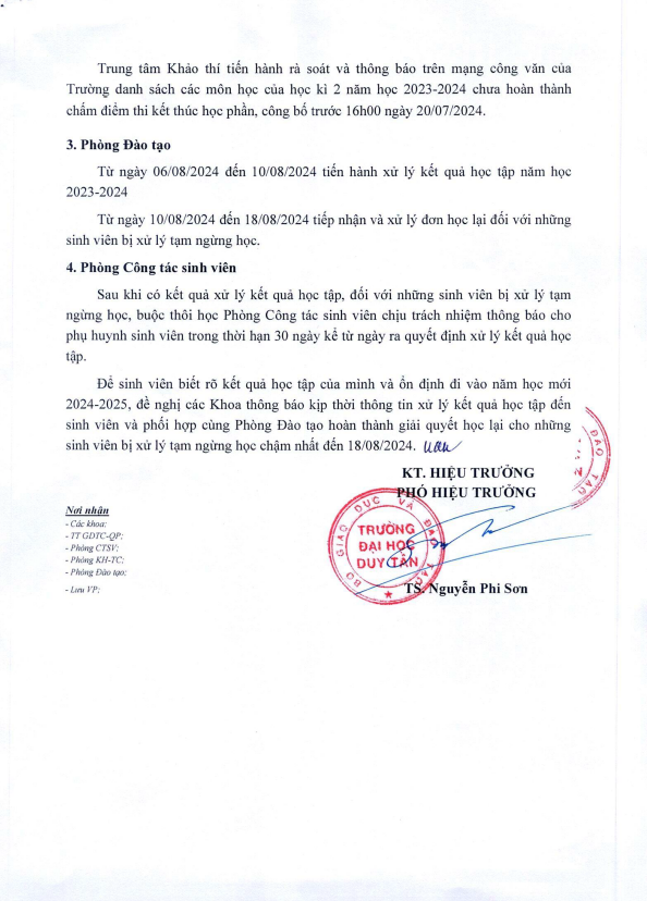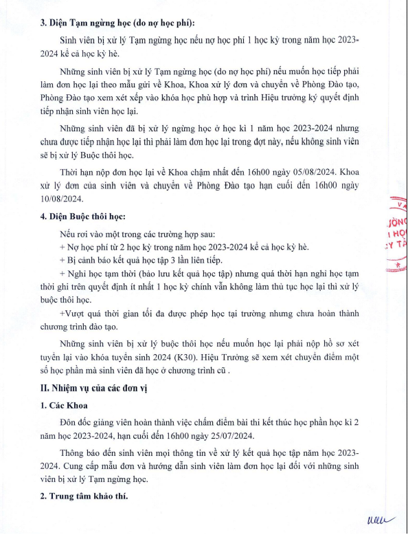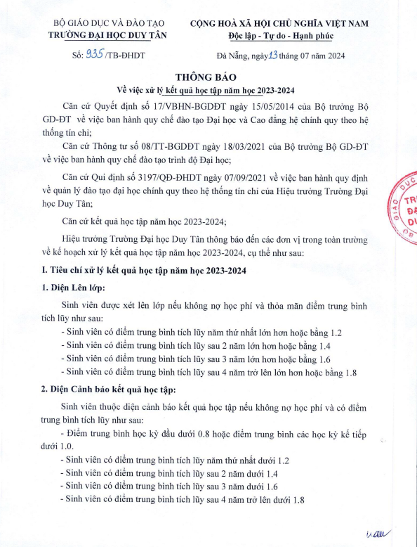 Thông báo về việc xử lý kết quả học tập năm học 2023-2024