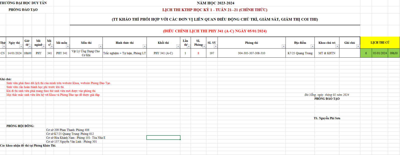 Lịch thi kết thúc học phần HK1 2023-2024 Tuần 19--20 (điều chỉnh PHY 341 (A-C)