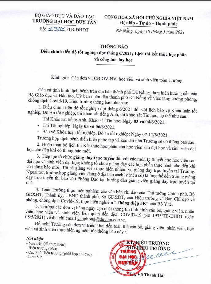 Thông báo về việc điều chỉnh tiến độ tốt nghiệp đợt tháng 6/2021 và lịch thi kết thúc học phần