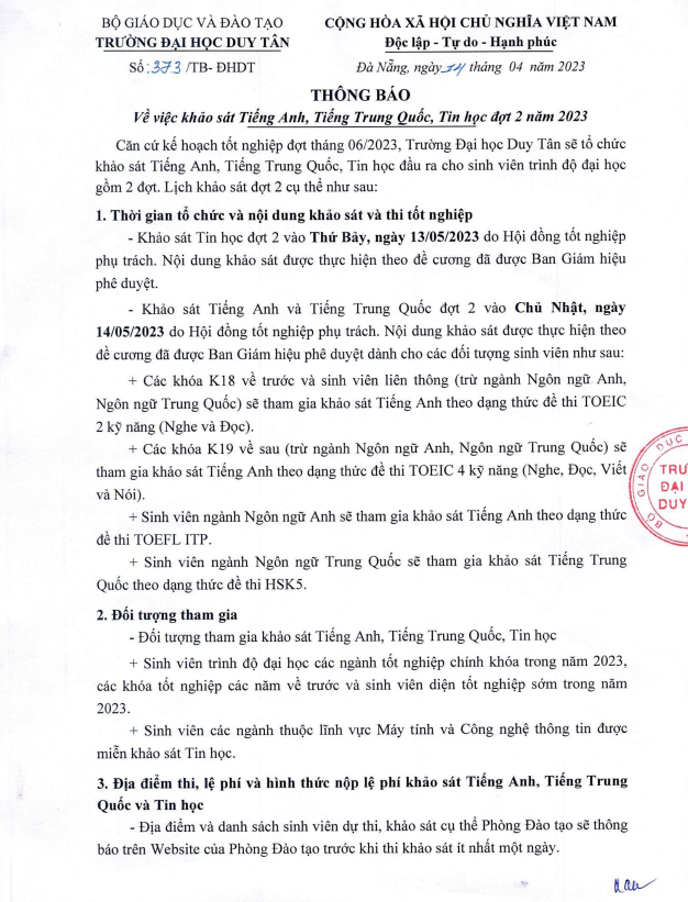 Thông báo về việc khảo sát Tin học, Tiếng Anh và Tiếng Trung đợt 02 năm 2023