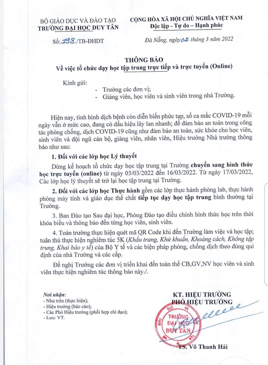 Thông báo về việc tổ chức dạy học tập trung trực tiếp và trực tuyến