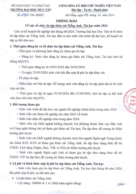 Thông báo Về việc tổ chức ôn tập khảo sát tiếng Anh, Tin học năm 2024