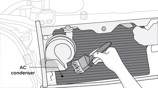 Tìm vị trí giàn nóng máy điều hòa. Nó thường được đặt phía trước bộ tản nhiệt. Nếu trong giàn nóng có lá cây, bụi bẩn hay vật cản trở khác, hãy vệ sinh khu vực đó.