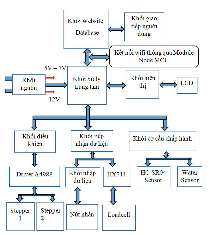 - Khối tiếp nhận dữ liệu: khối nhập dữ liệu ( nút nhấn), module HX711 ( cân loadcell).