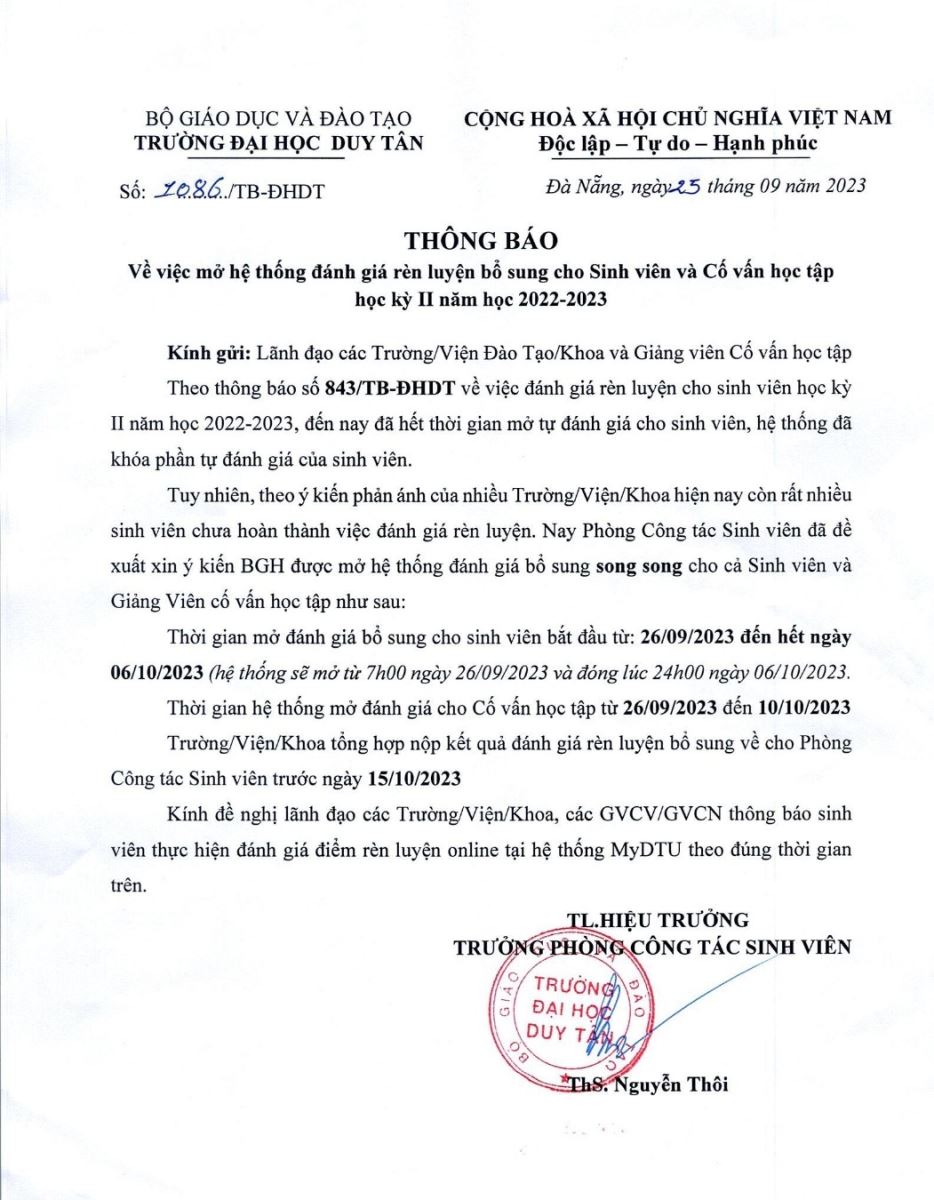 Thông báo về việc triển khai đánh giá rèn luyện học kỳ 2 năm học 2022-2023 (Đợt bổ sung)