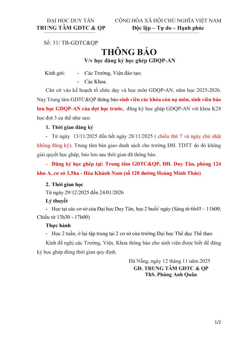 Thông báo đăng ký học ghép giáo dục quốc phòng - an ninh