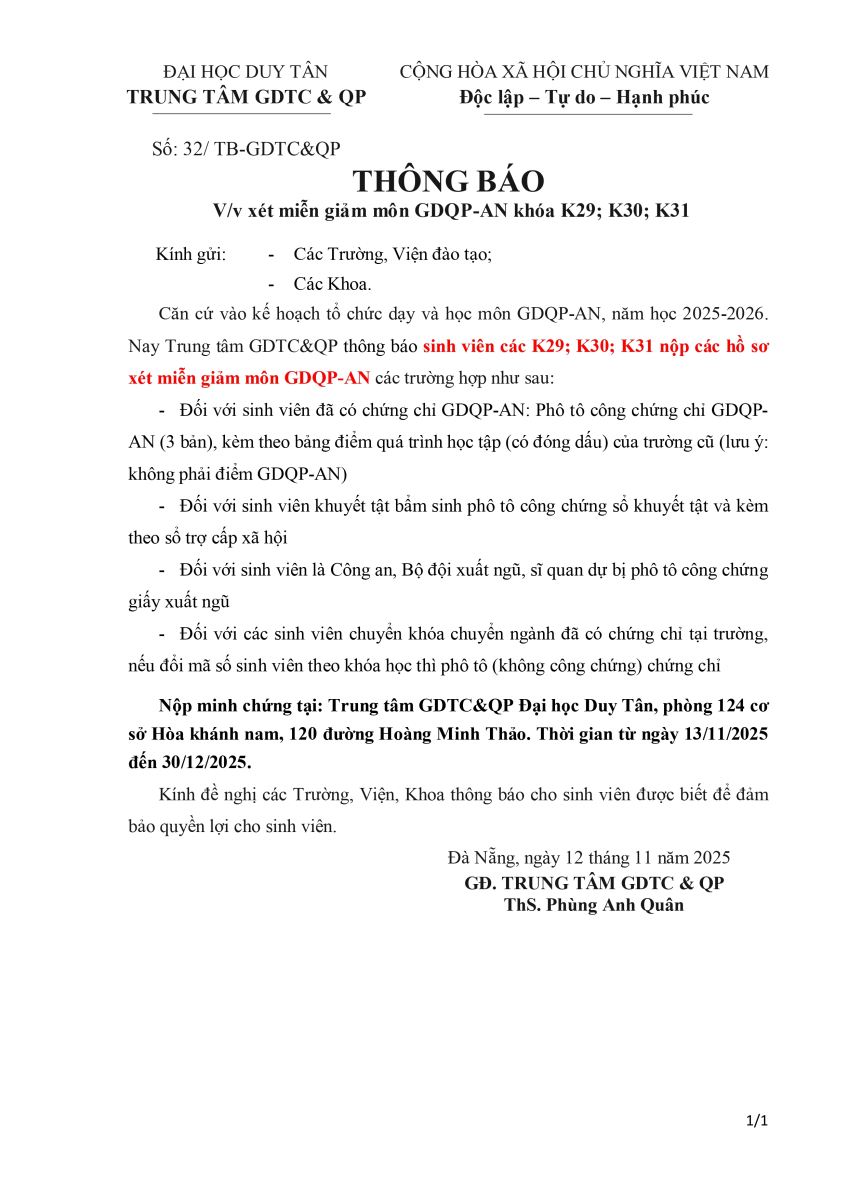 Thông báo nộp hồ sơ minh chứng xét miễn giảm môn Giáo dục quốc phòng - An ninh sinh viên các khóa K29, K30, K31