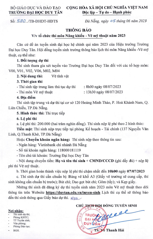 Thông báo tổ chức thi môn Năng khiếu - Vẽ mỹ thuật năm 2023
