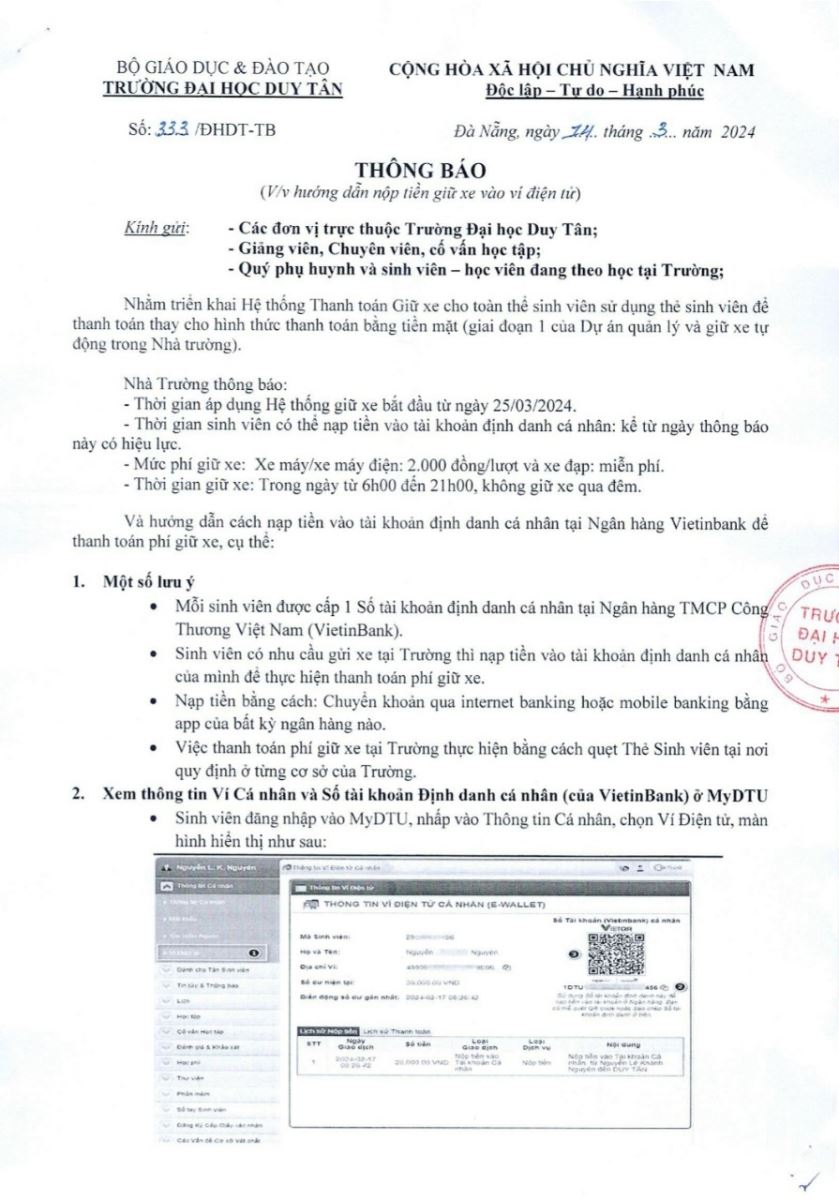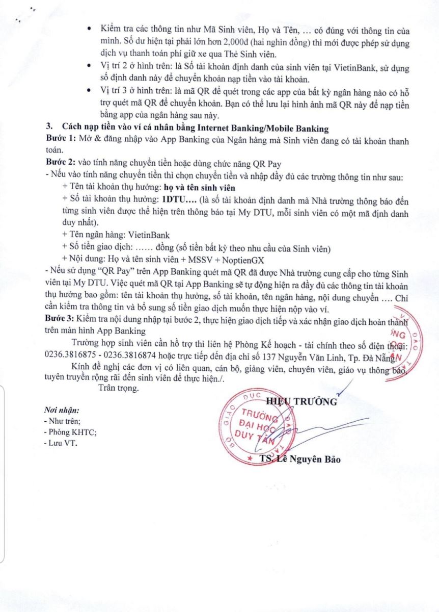 Thông báo về việc hướng dẫn sinh viên nộp tiền giữ xe vào ví điện tử