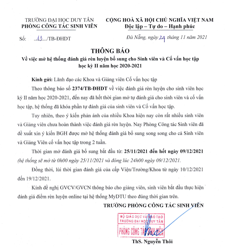 Thông báo về việc mở hệ thống đánh giá rèn luyện bổ sung cho sinh viên học kỳ 2 năm học 2020-2021