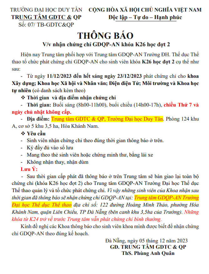 Thông báo về việc nhận chứng chỉ giáo dục quốc phòng và an ninh khóa K26 - Đợt 2