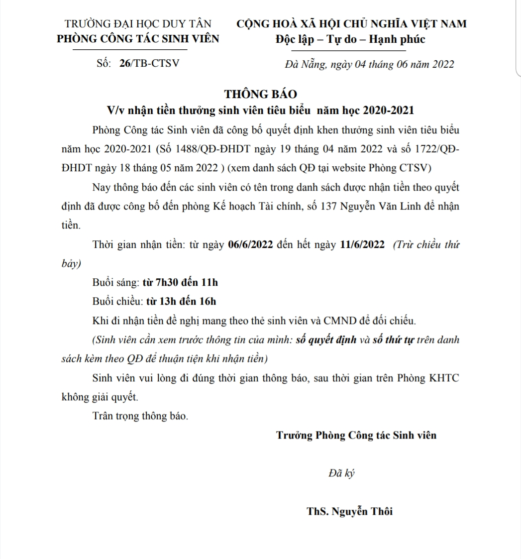 Thông báo về việc nhận tiền khen thưởng sinh viên tiêu biểu năm học 2020-2021