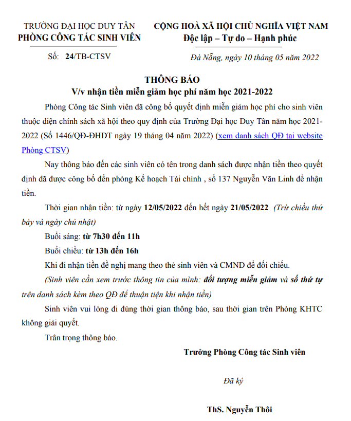 Thông báo về việc nhận tiền miễn giảm học phí năm học 2021-2022