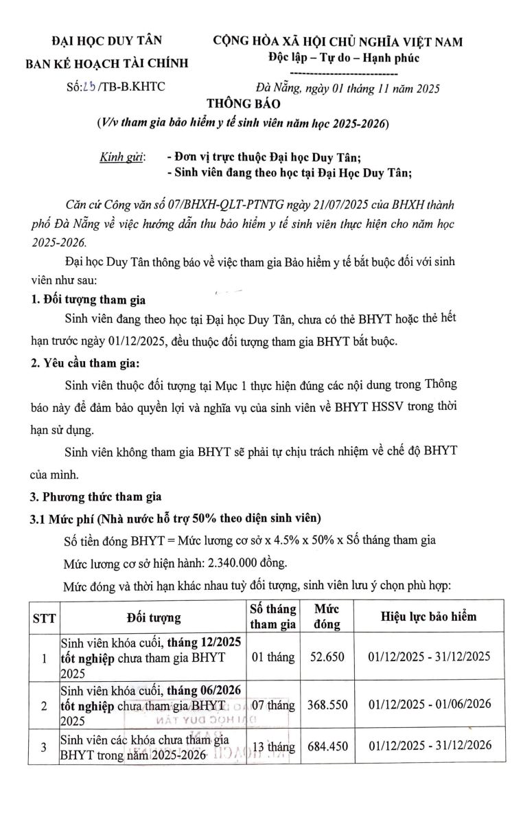 Thông báo về việc thực hiện Bảo hiểm y tế năm học 2025-2026 (T11/2025)