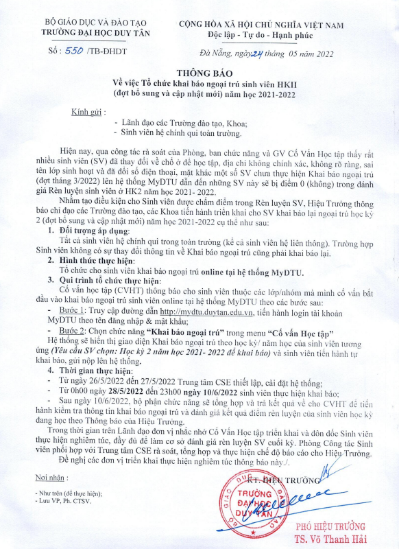 Thông báo về việc tổ chức khai báo ngoại trú sinh viên HK2 năm học 2021-2022 (bổ sung và cập nhật mới)