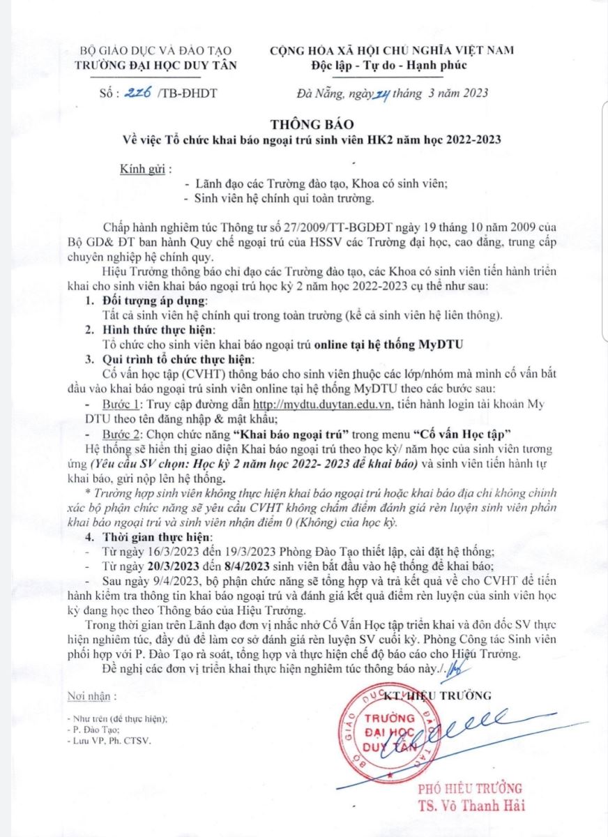 Thông báo Về việc Tổ chức Khai báo Ngoại trú Sinh viên HKII - năm học 2022-2023