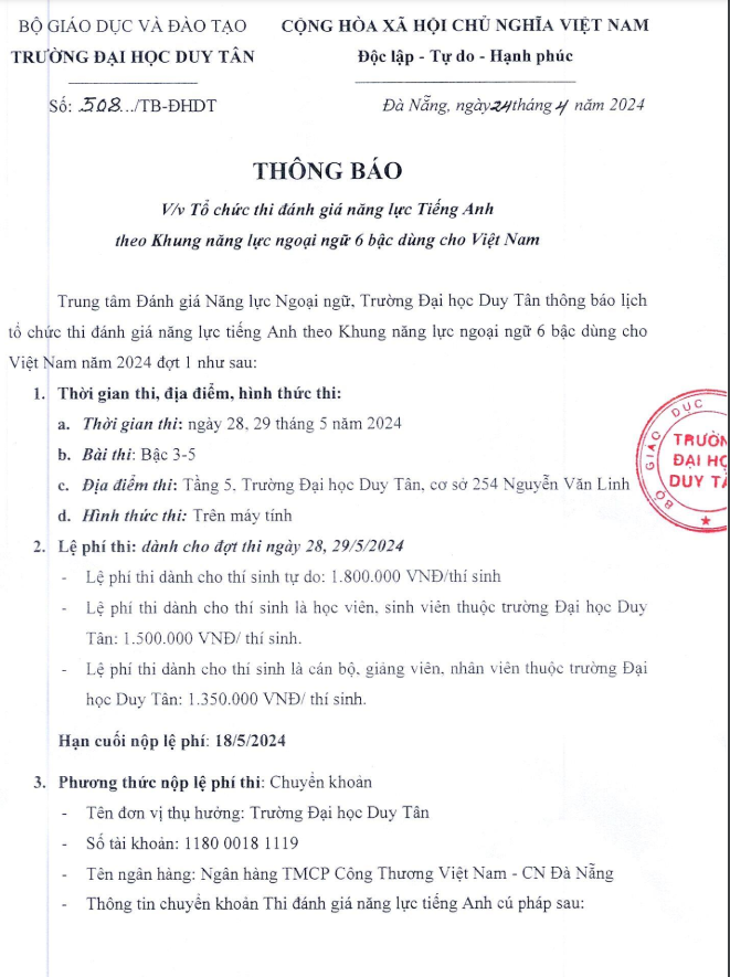 Thông báo về việc tổ chức thi đánh giá năng lực tiếng Anh theo khung năng lực ngoại ngữ 6 bậc