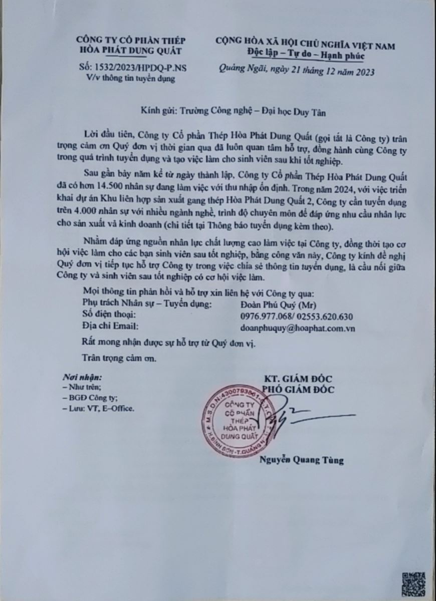 Thông báo về việc tuyển dụng của công ty cổ phần Thép Hòa Phát - Dung Quất