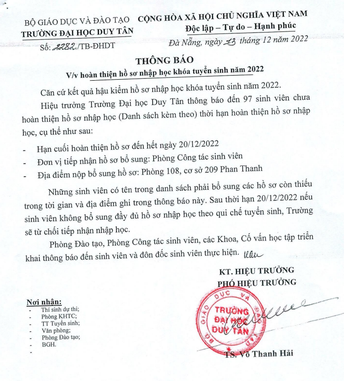 Thông báo v/v hoàn thiện hồ sơ nhâp học khóa tuyển sinh năm 2022
