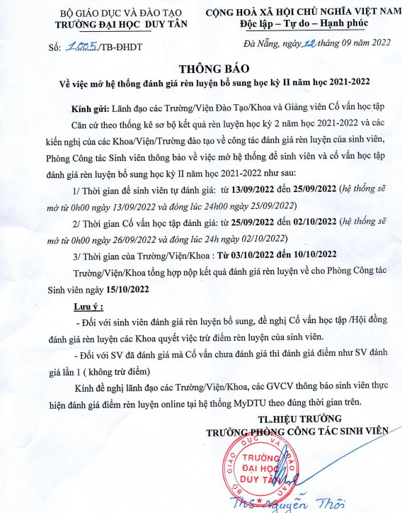 Thông báo về việc mở hệ thống đánh giá rèn luyện bổ sung Học kỳ II năm học 2021-2022