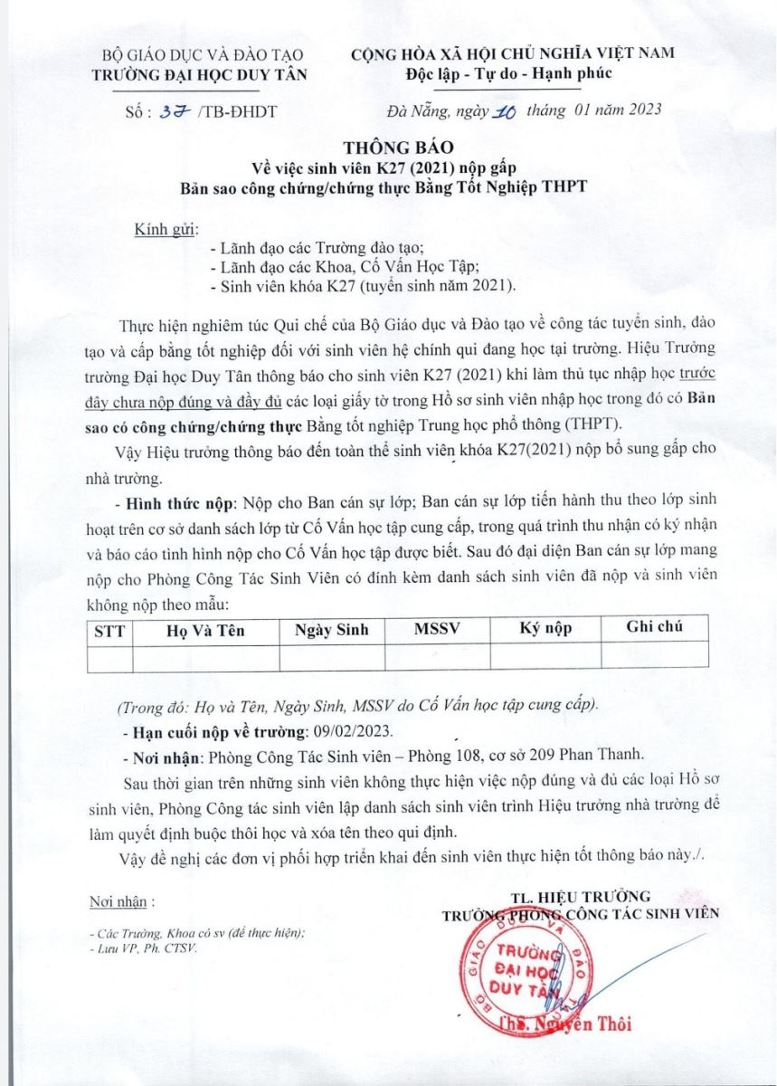 Về việc sinh viên K27 (2021) nộp gấp Bản sao công chứng/ chứng thực Bằng tốt nghiệp THPT