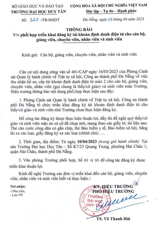 V/v phối hợp triển khai đăng ký tài khoản định danh điện tử cho cán bộ, giảng viên, chuyên viên, nhân viên và sinh viên
