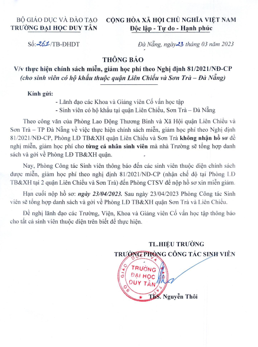 V/v thực hiện chính sách miễn, giảm học phí theo Nghị định 81/2021/NĐ-CP (Cho sinh viên có hộ khẩu thuộc quận Liên Chiểu và Sơn Trà - Đà Nẵng)