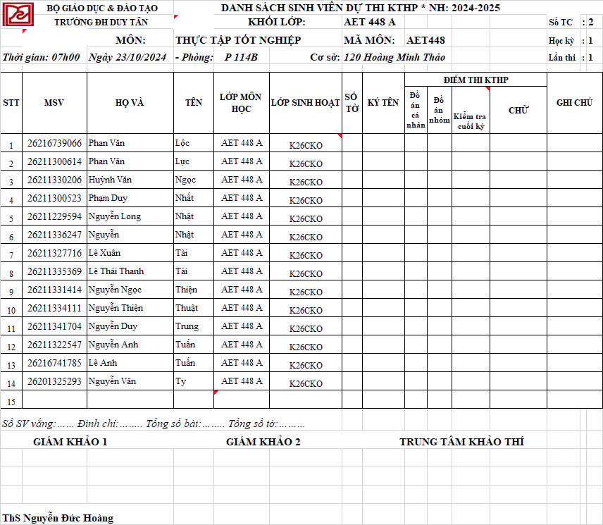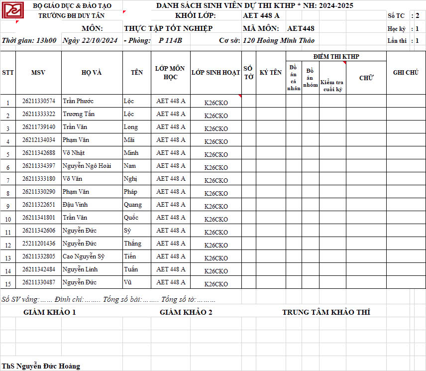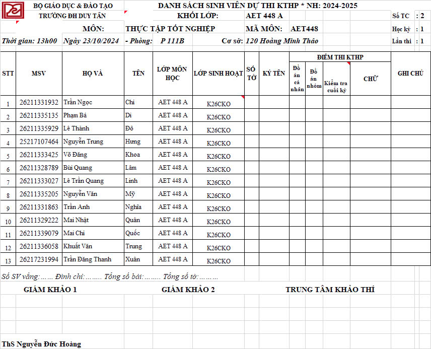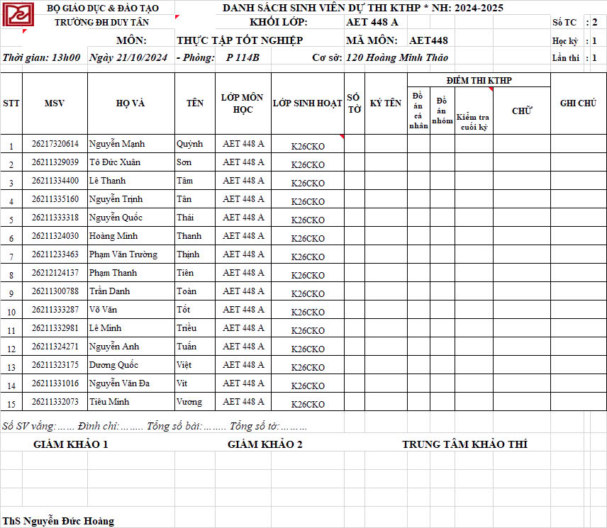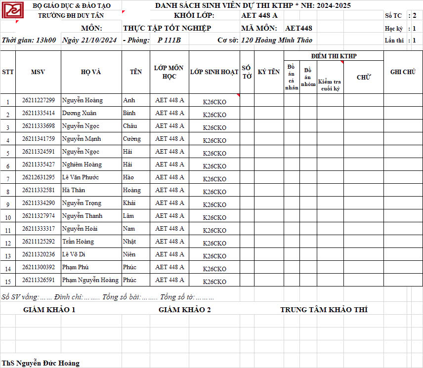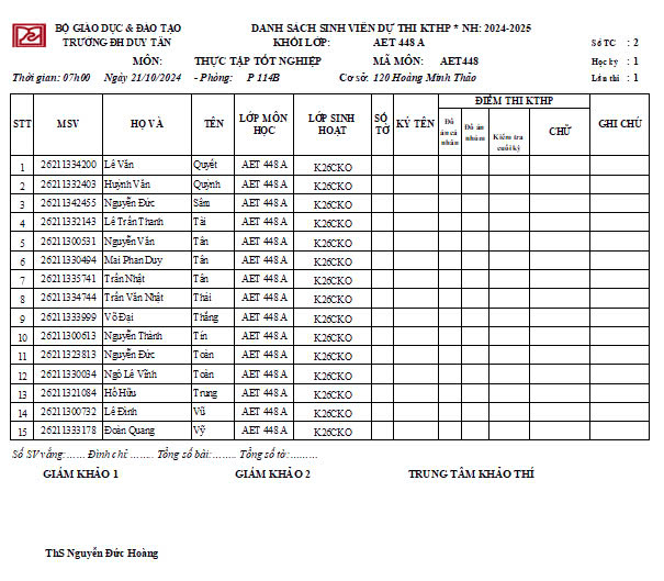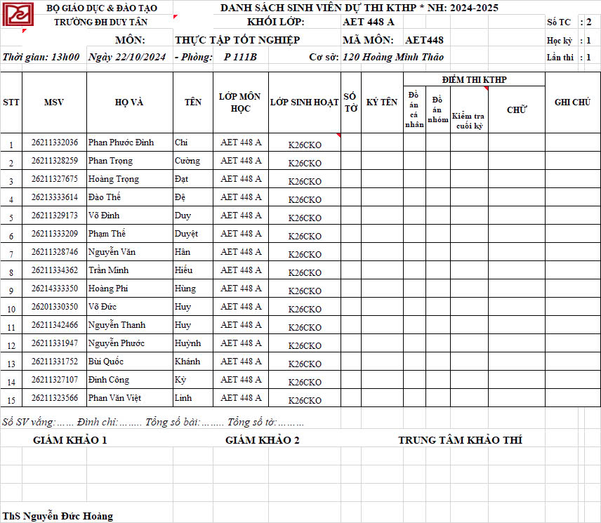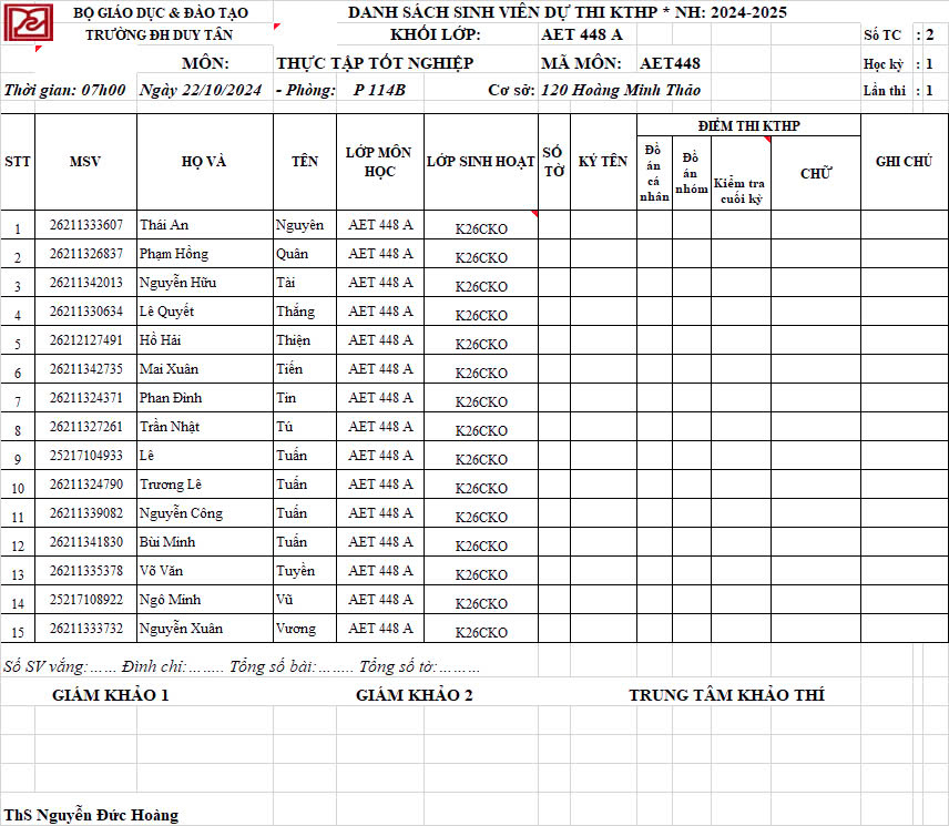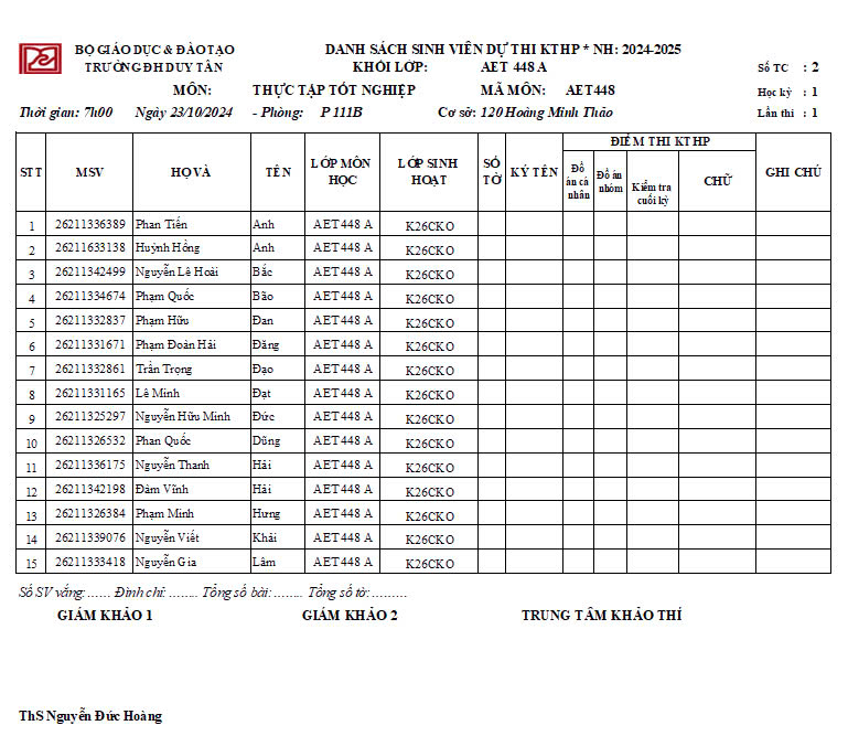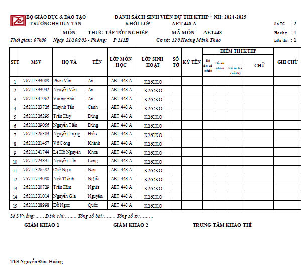 Danh sachhs thi AET 448 ( Bảo vệ Thực tập tốt nghiệp ) Khóa K26