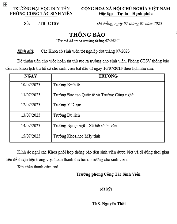 Thông báo về lịch trả hồ sơ ra trường đợt tháng 07/2023