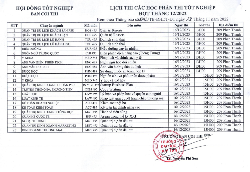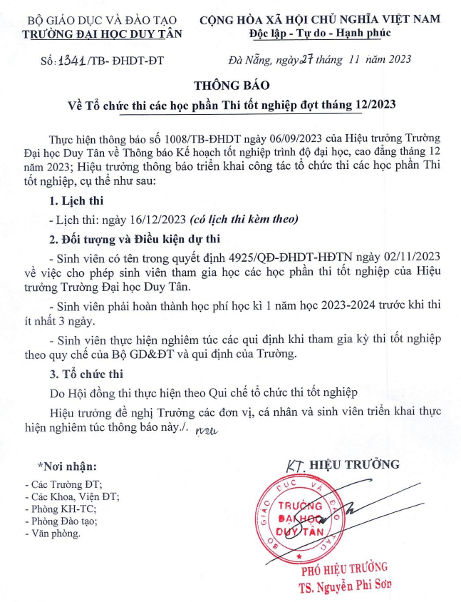 Thông báo về việc tổ chức thi các học phần Thi tốt nghiệp đợt tháng 12/2023