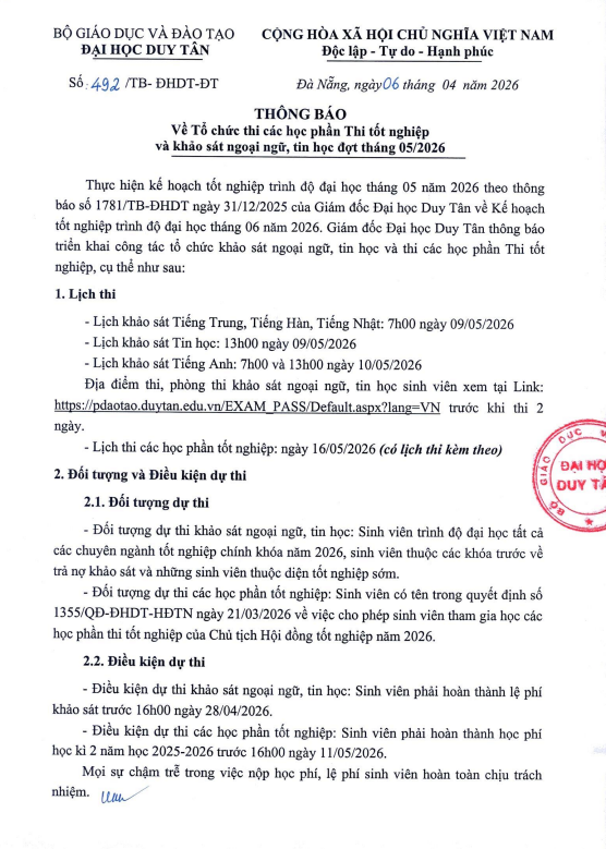 Thông báo về việc tổ chức thi các học phần Thi tốt nghiệp và khảo sát ngoại ngữ, tin học đợt tháng 05/2026